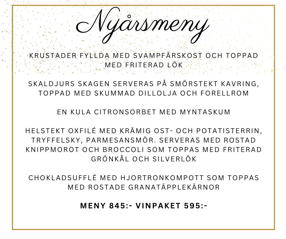 För dig som hellre tar hand om dina gäster än står vid spisen på nyårsafton erbjuder vi en 3-rätters nyårsmeny för avhämtning.