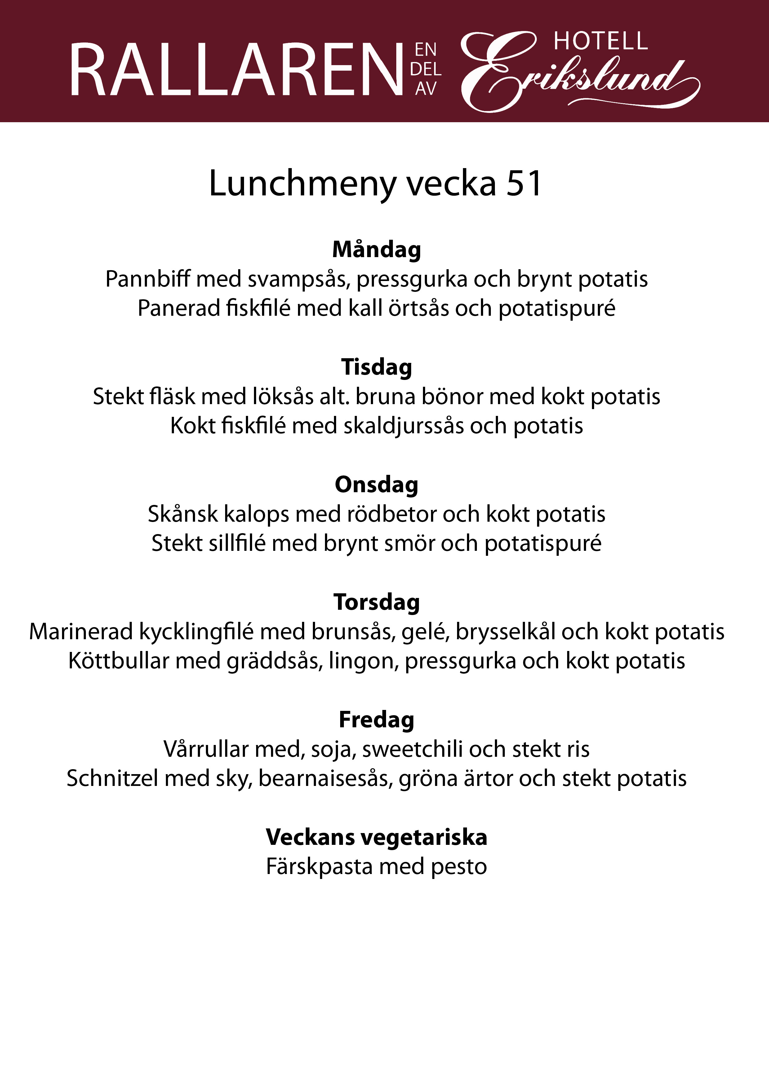 Gäller på Dagens lunch i våra lunchrestauranger på Hotell Erikslund och Rallaren